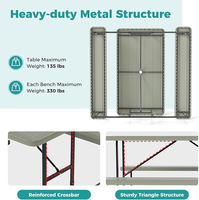 - [Heavy-duty Metal Structure]: The integrity of the rectangle table with 2 benches is enhanced by the robust powder-coated metal frame. Additionally, adjustable footpads are included to ensure stability on uneven surfaces, preventing wobbling during use.