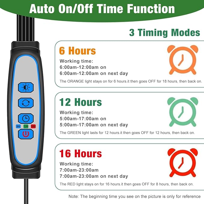 - [Upgraded Timer 6 12 16H] This grow light has a new upgraded timer, we can set the time to 6 12 16H. Through research, most plant lights on the market do not exceed 12 hours, 16H is more suitable for your plant growth. According to your setting, it will turn on and off automatically every day