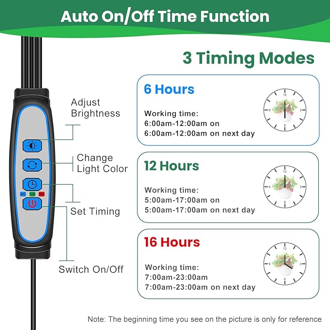 - [Auto On or Off & Precise Timer] The plant light with automatic memory timing function can be automatically turned on/off every day according to your settings (6H 12H 16H) requires no manual operation. The grow light will be convenient to take good care of your plants when you go out to work or on vacation
