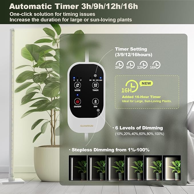 - 【Automatic Timer】With a timer function that can be set for 3, 9, 12 or 16 hours, you can choose the desired time, and it will automatically turn on/off at the same time each day. Simply set it once, and the light will operate according to your preset schedule, saving you time and effort while ensuring your plants receive optimal lighting for healthy growth.