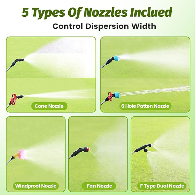 - 💗 【4 Nozzles & 40" Extended Reach Power Sprayer 】Equipped with 3 adjustable spray patterns and 4 nozzles, this electric sprayers in lawn and garden adapts to any garden task, Whether for spraying delicate plants with fine mist or giving the lawn a powerful spray. The 40" wand and long hose deliver a wide spray area, making it an excellent backpack sprayer battery powered sprayer for hard-to-reach spots.