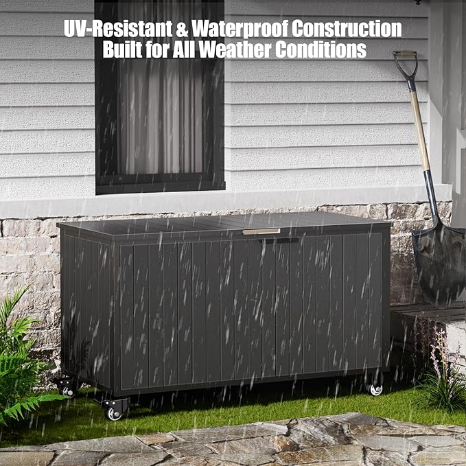 - Wheeled Storage Design: The Deck Box features wheeled storage, offering convenient mobility. This thoughtful design allows you to easily move the storage box around your outdoor space, making it convenient to access whether you are indoors or outdoors.