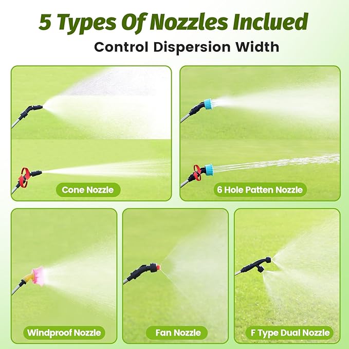 - 💗 【 4 nozzles & 40" Extended Reach Power Sprayer】Equipped with 3 adjustable spray patterns and 4 nozzles, this electric sprayers in lawn and garden adapts to any garden task, Whether for spraying delicate plants with fine mist or giving the lawn a powerful spray. The 40" wand and long hose deliver a wide spray area, making it an excellent backpack sprayer battery powered sprayer for hard-to-reach spots