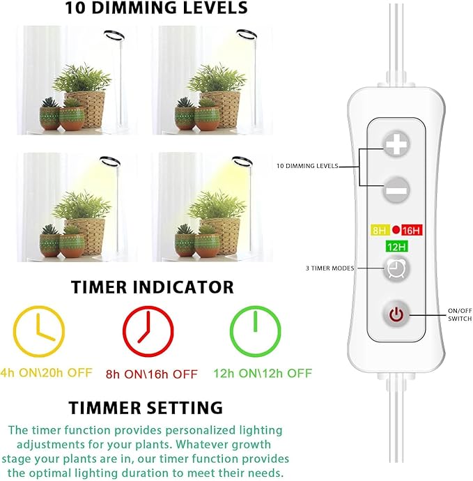 - 24H Automatic Timer,On/Off Switch: The lamp operates from a built-in timer with 3 modes cycle timing function which stay on for 8/12/16 hour and off for 16/12/8 hours. The timer sets itself when one plugs-in,full control when the light turns on and off, simply by on/off switch as you needed,no need to unplug/re-plug.