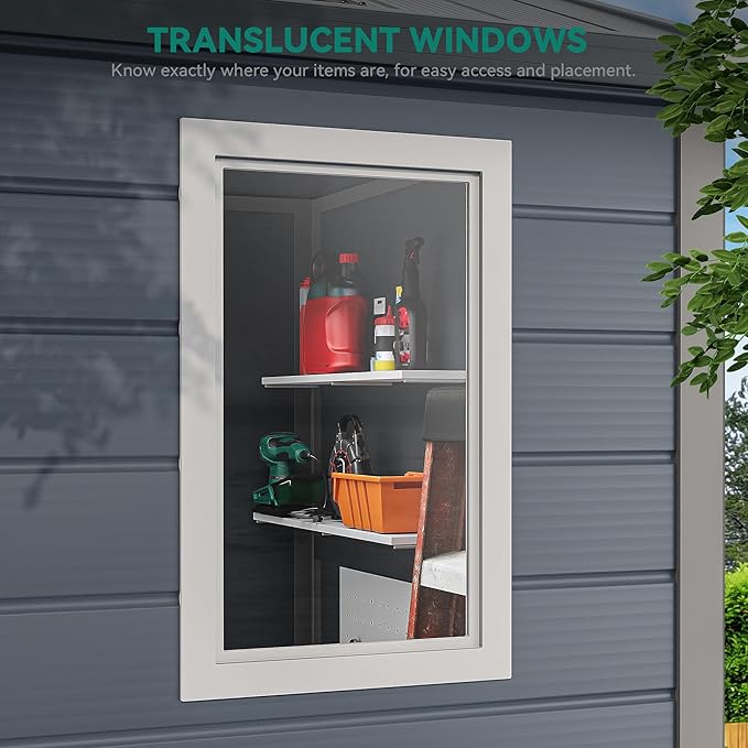 - Ventilated & Transparent: Our garden tool storage shed features a lockable door for secure storage, translucent side windows to allow natural light in, louvered vents promote airflow, and the sloped roof prevents water buildup while facilitating drainage