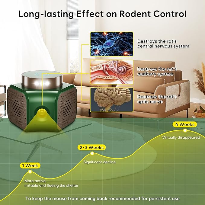 - 🦇🐀🐿🕷【How Mouse Repellent Works】Our ultrasonic mouse repellent uses intelligent variable frequency ultrasonic and PIR infrared sensors and flash lights. When rodents are close, it will trigger ultrasonic and pulse waves to disturb their nervous system and auditory systems, causing them to feel uncomfortable and flee the area. Built-in 9 LED strobe lights disturb their activity in a dark environment, being extremely irritating to rodents and pests. Get a pest-free space within a month.
