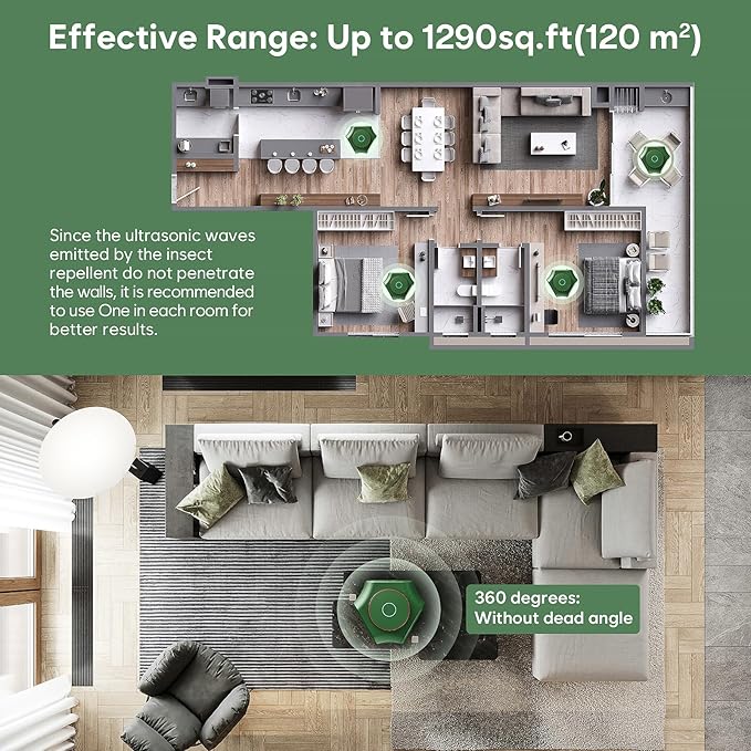 - 【Efficient Property Protection】The ultrasonic mouse deterrent fits almost any nook or cranny in your home with an outlet. Small size, wide coverage. 360°Ultrasonic release, effective protection area up to 1290sq.ft.Our pest repellers are suitable for a variety of environments including homes, warehouses, garages, gardens and more. Save your money for rodent control, and prevent your property in mice damage. Note:There shall be no obstacles within 3.3ft (1 meter) of the ultrasonic pest repeller.