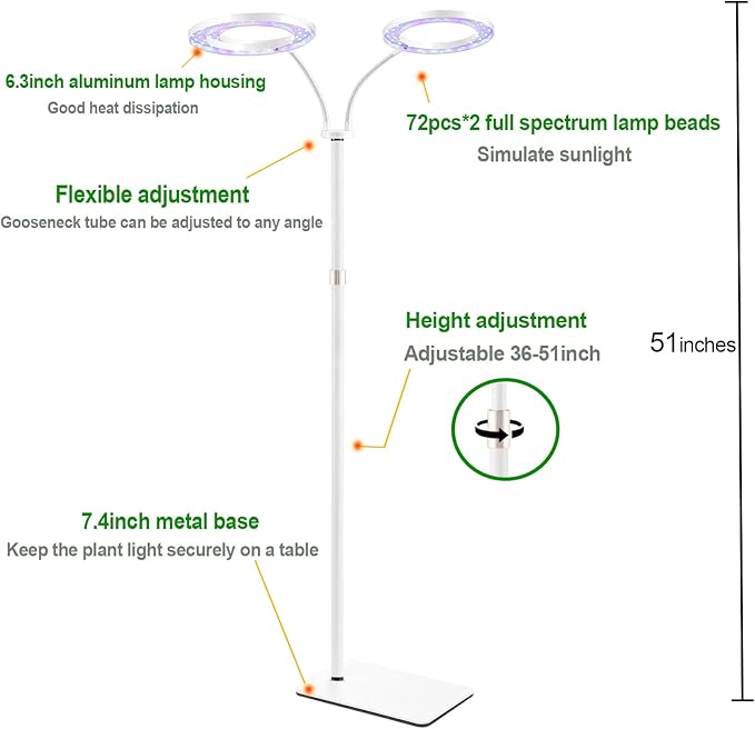 - Height adjustable and 10 Level Brightness: The height range is 36"-51",It also has 10 brightness settings, from 10-100% to meet each plant's lighting requirements at different stages.