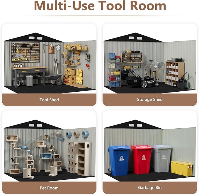- 【Value Tool shed kit】 This metal storage shed comes standard with moisture-proof floor mats, sensor solar lights, leaf bands and door locks, each of which meets your needs and provides you with a good experience.