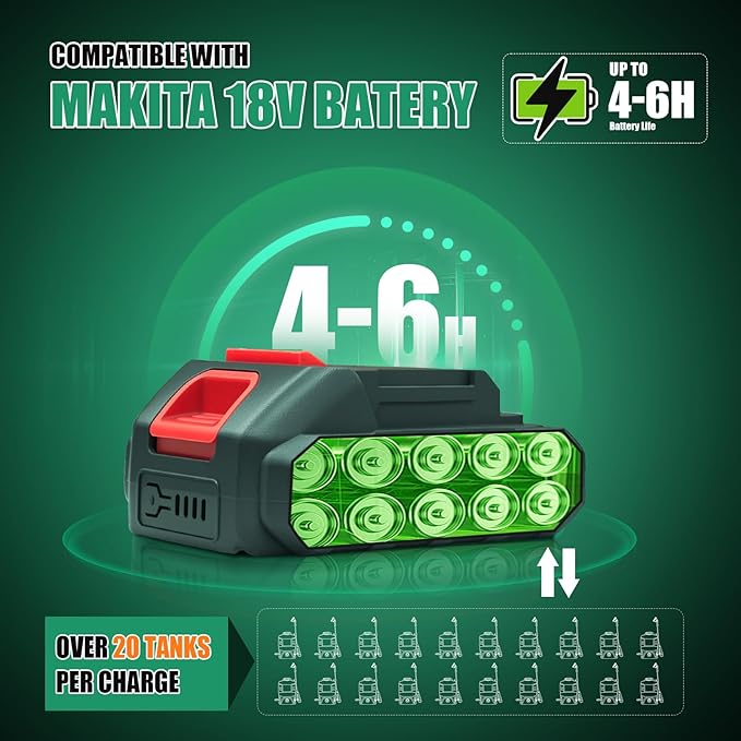 - 【More Efficient and Safer-Once Charge 20 Tanks Spraying】Powered by 21V Powerful lithium battery, once charge covering up to 20 tanks (4 gallon each) and providing up to 3 hours of continuous spraying. Compatible with Makita batteries, the battery powered sprayer can easy swapping battery for continuous use. Simultaneously equipped with low-voltage power-off protection to ensure safety