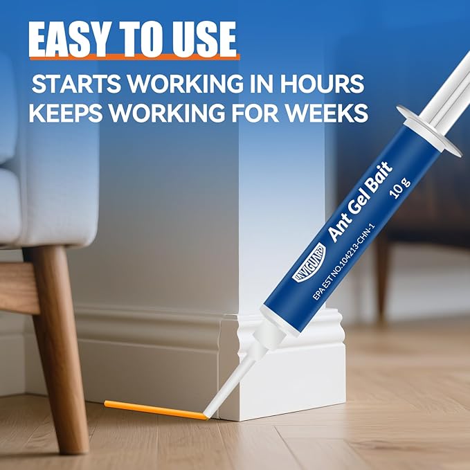 - 【LONG-LASTING PROTECTION】:Achieve colony control for up to 2 months using our ant gel bait. This ant bait can easily be applied to any surface, providing powerful ant control to help ensure a secure, peaceful home environment. Begin by inspecting and identifying ant infestations, whether they are indoors or outdoors. Apply the bait gel strategically in specific areas where ants are visibly trailing, including cracks, crevices, beneath appliances and in concealed spaces like attics and crawl spaces, to achieve comprehensive control.