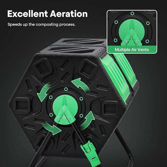 - Stable and Durable Build: Constructed from weather-resistant, BPA-free PP plastic and reinforced with a strong steel frame. This composter is designed to stay upright and stable during regular rotation and outdoor use.