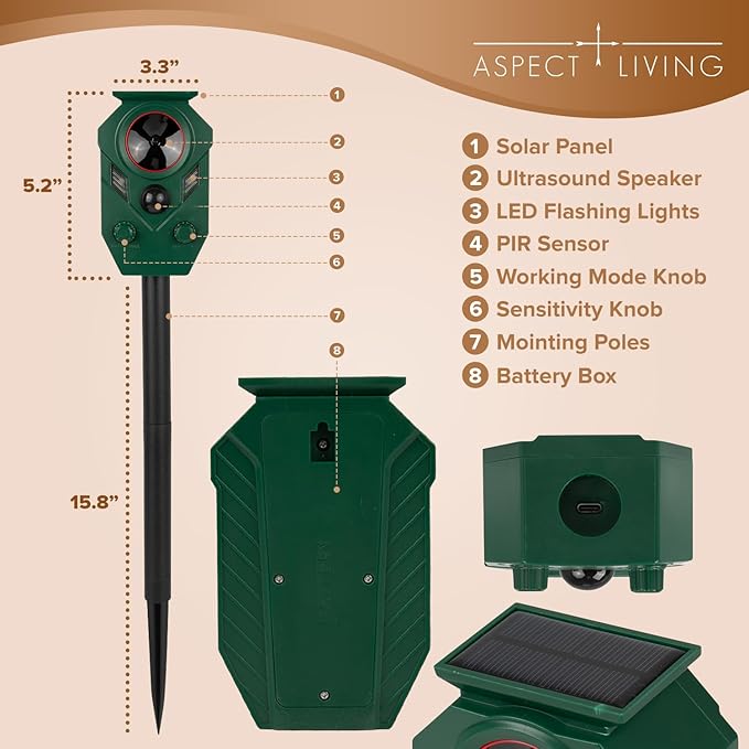 - Powerful Ultrasonic & Flash Deterrent - Advanced ultrasonic waves and flashing LED lights effectively scare away a wide range of animals without harming them. Ideal for protecting your garden, yard, or farm.