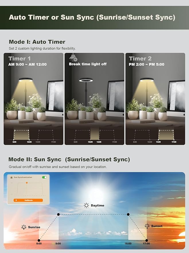 - 【Smart Bluetooth App with Plant Database】: Take full control of your grow light with our easy-to-use Bluetooth app! Access a smart plant database with growth habits and light needs—perfect for beginners to find the right lighting setup. Customize schedules, sunrise/sunset times, brightness levels, and even use weather simulation to optimize indoor plant growth. Bluetooth connection enables remote control for added convenience and flexibility.