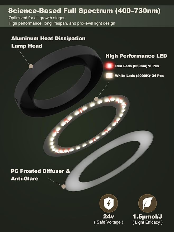 - 【Durable Build & 2-Year Warranty】: Engineered for longevity with a heat-dissipating aluminum alloy lamp head, a durable aluminum alloy telescopic pole (extending 7 inches), and a tough PC Frosted Diffuser(120° wide-angle light), ensuring an impressive 50,000-hour lifespan. Plus, enjoy peace of mind with our 2-year warranty on these plants grow lights. Choose GLOWRIUM for reliable, long-lasting support for your indoor oasis!