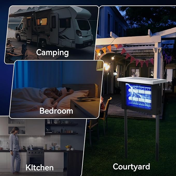 - UNINTERTUPRED: This solar mosquito zapper outdoor ensures uninterrupted pest control through dual charging options.Its built-in high-capacity rechargeable battery supports two charging methods: a 10W solar panel or DC fast charging. Featuring smart charging technology, bug zapper solar powered achieves a full charge in just 4-6 hours and delivers up to 10 hours of continuous operation per charge.