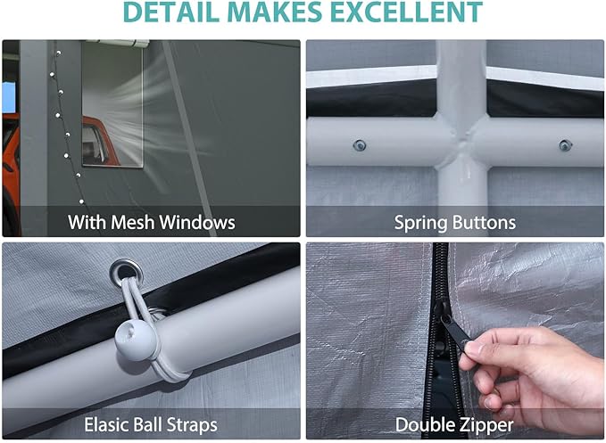 - 【Ventilated Design】: Featuring two mesh windows on each sidewall, this portable garage enhances airflow and reduces moisture, keeping your vehicle dry and protected.