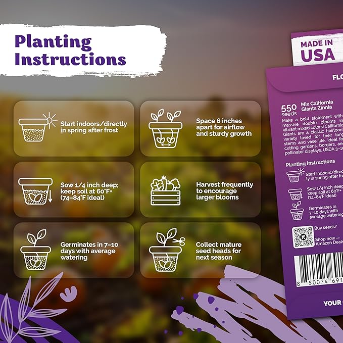 - Fast Germination: zinnia seeds for planting sprout in 7-10 days at 74-84 °F; sow california giants zinnia seeds 1/4" deep for vigorous starts, perfect garden seeds for fresh cut flowers and pollinator mixes.