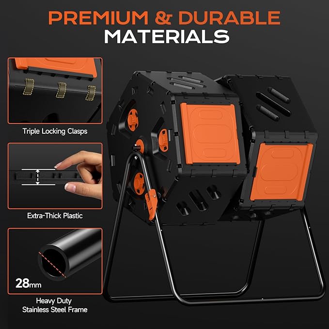 - 【Effortless 360°Tumbling Design】Each chamber of this compost tumbler can rotate 360°and is designed with built-in mixing ribs. Just spin to mix the contents, say goodbye to manual turning of the compost. The front of the chamber is designed with deep grooves for easy grip when rotating the compost bin, and the side is designed with rotation lock clips to fix the drum for safe filling