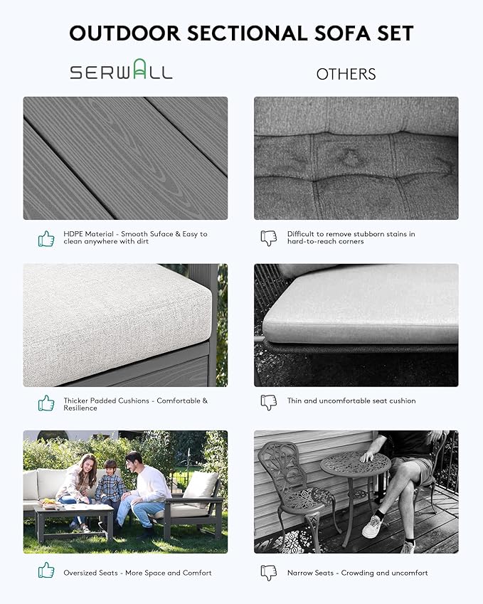 - Exceptional Durability & All Weather: Crafted with HDPE material, this outdoor sectional sofa is built to last, withstanding the test of time and heavy use, each seat can hold up to 360LBS. The weather-resistant HDPE material ensures that this sofa can withstand various weather conditions, making it perfect for outdoor use.