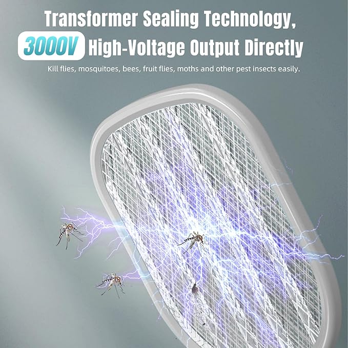 - ELECTRIC BUG ZAPPER & MOSQUITO ZAPPER-Rechargeable Electric Bug Zapper with 3000-volts of power that enough to kills most small flying insects in a flash. Instantly eliminating mosquitoes, flies, spiders, yellow jackets, and wasps in a single swing. No more pesticides or potentially harmful sprays. Non-Toxic, Safe for you and your family & Pets!