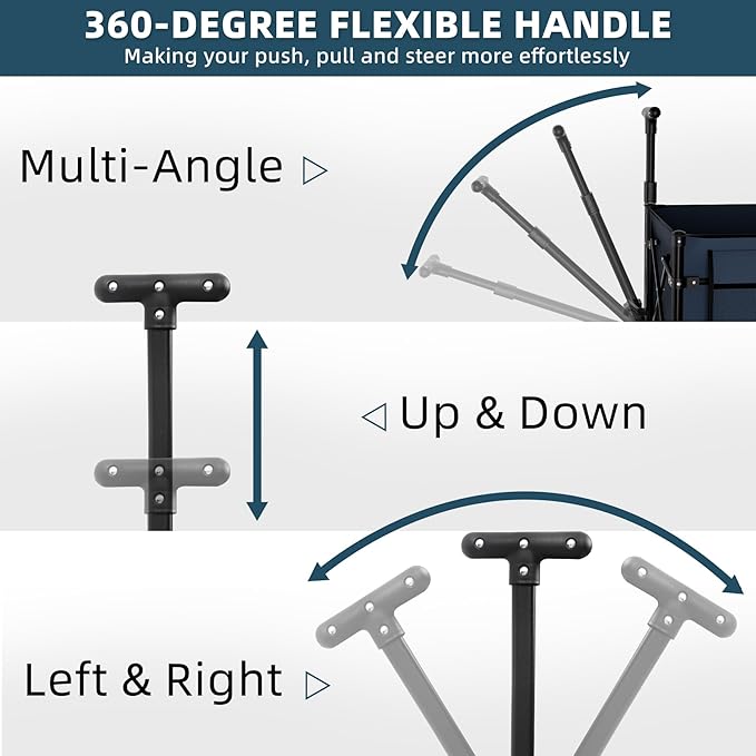- Wide All-Terrain Wheels with Brake & Adjustable Handle - The folding wagon equipped with two front 360Β° rotating off-road wheels with brakes, ensuring a smooth pull and easy transport on most kinds of ground surfaces like the cobbled road, asphalt, dust, and grass. The functional handle can be easily adjusted into any angle you preferred, and 22.5'' -34'' height range is suitable for different users, to your push and pull more effortlessly.