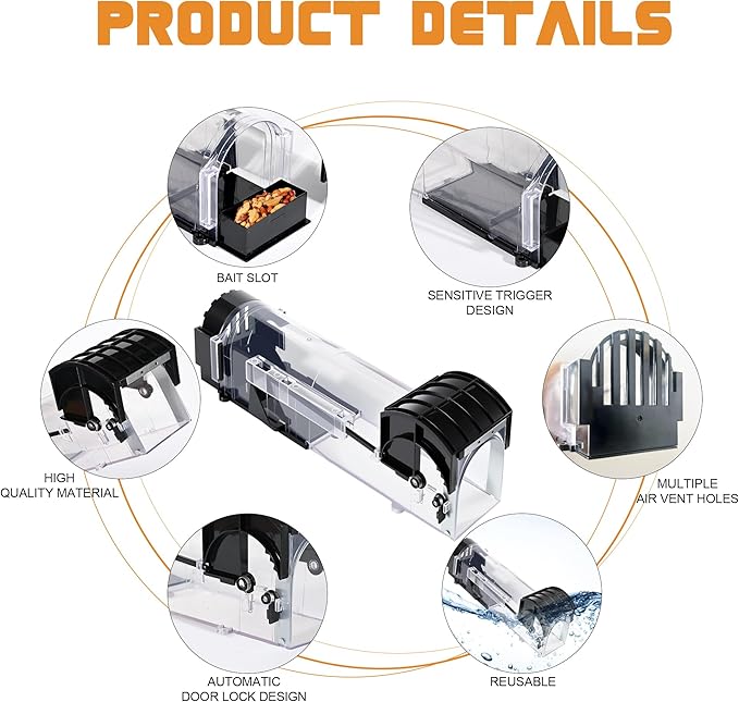 - 【High Sensitivity Rat Trap】: This advanced mouse cage design ensures that all components fit together seamlessly to optimize the sensitivity of the trap. Once the animal steps on the pedal, the humane rat trap will react quickly and close the exit without harming the animal.