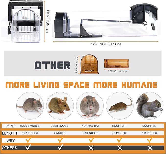 - 【Perfect Dimensions】: 12.2" x 3.3" x 3" Humane Mouse Trap – The outdoor rat traps are cuboid, which is easy for rats to enter and ensures the best use of space. The squirrel trap is designed to reduce the incidence of capture errors and ensure that only the target rodent is captured.