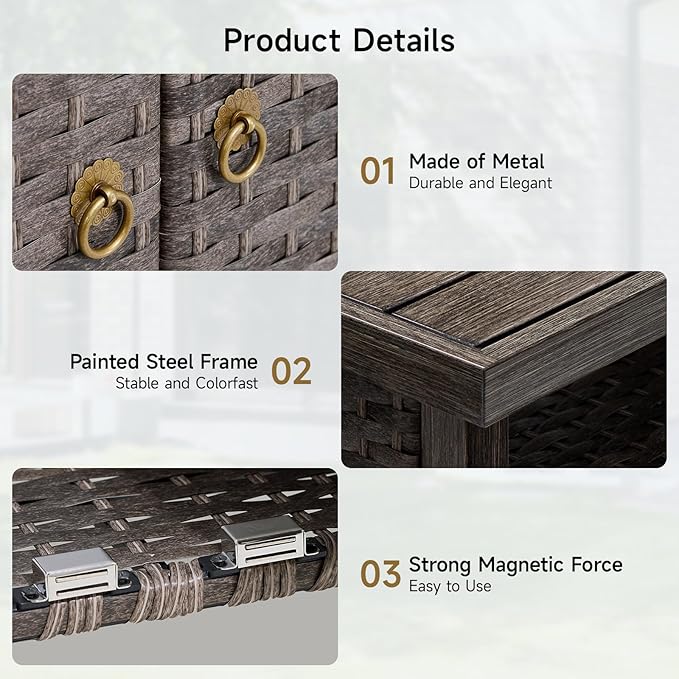 - Weatherproof Materials: Rain or shine, this patio cabinet stays elegant! Handwoven PE rattan brings nice texture that resists cracking, paired with a painted steel frame that resist rust and sunburn. Whether on a sunny patio or in a humid environment, rotting and fading are no more. Tough enough for outdoors, chic enough for indoors!