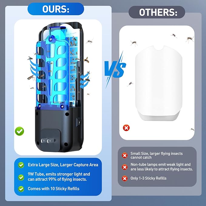 - 【Convenience & Efficiency】Plug-in indoor mosquito trap design is compatible with standard sockets, eliminating the need for complex installation steps. Flying insect trap comes with a replacement kit of 20 sticky glue cards, and it only takes 3 seconds to replace the glue cards. Each card can be used continuously for 15 to 90 days. It supports 24-hour uninterrupted operation, covering an area of 20 to 30 square meters for pest and disease control, reducing the cost of repeated purchases