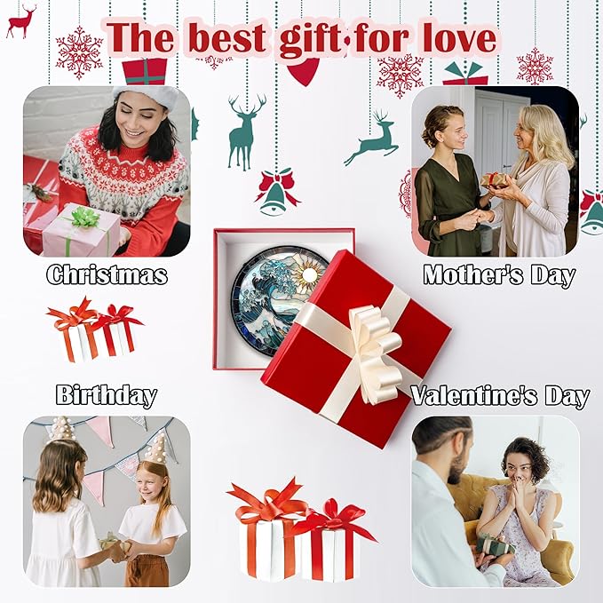 Stained Glass Window Hanging - White Sun Big Wave Suncatcher for Door Terrace Garden Home Decor Blue Ocean Landscape Sun Catcher Birthday Gifts for Lovers Women Men Dad Mom Nana 11.8 in