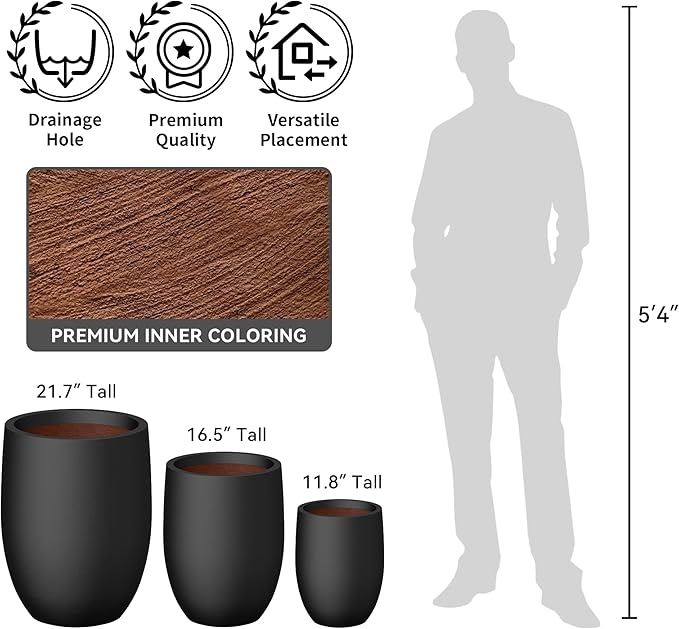 Kante 11.8 Inch Tall Concrete Planter, Large Indoor Outdoor Plant Pot with Drainage, Smooth Black Finish with Warm Brown Interior, Ideal for Porch, Home, Garden, Patio