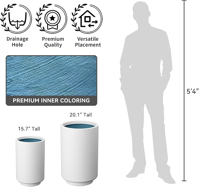 Kante 20.1 Inch Tall Concrete Planter, Round Pedestal Design Garden Pot for Indoor Outdoor Plants, Modern Garden Pot with Drainage Hole, White Finish with Aqua Blue Interior