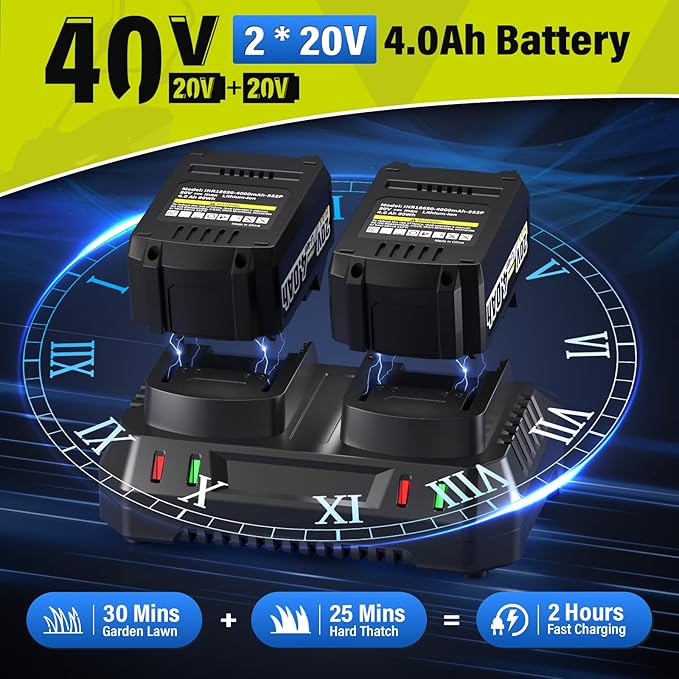 - Dual Battery System for Extended Runtime: Comes with 2 20V 4.0Ah lithium-ion batteries, providing longer runtime to tackle large lawn areas with ease. The batteries support fast charging, ensuring they are always ready for use and meeting your extended mowing needs