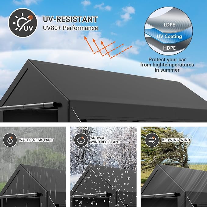- 【Heavy Duty Carport】The carport canopy is made of 180 grams PE tarpaulin with industrial grade galvanized steel and reinforced crossbars, with artfully welded frame joints. It can withstand wind gusts of over 55 MPH and protects your car or boat from sun, rain and UV rays.