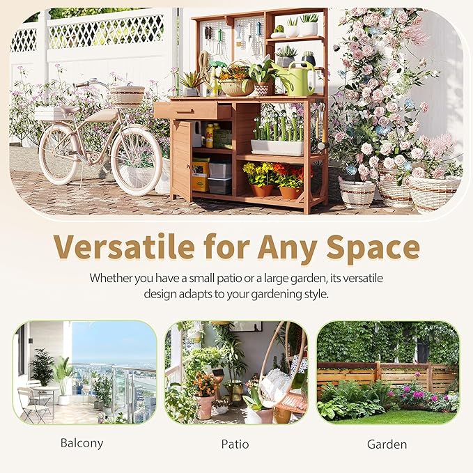 - Spacious and organized: 50.2-inch work surface 🌿 Enjoy ample space for potting and planting with a spacious work surface, plus a convenient upper storage cabinet. Keep your tools organized with hooks, shelves, drawers, and adjustable cabinets—all within easy reach!
