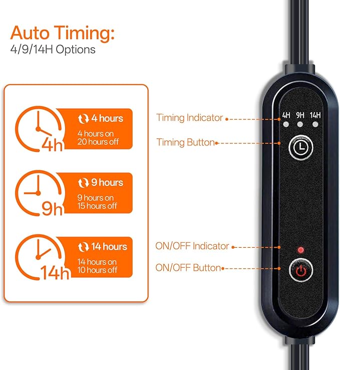 - Automated Lighting Schedules - Enjoy hands-free plant care with our auto on/off timer function offering 4/9/14-hour preset options. Simply set your preferred schedule—no more manual switching needed—to ensure consistent daily light cycles for healthier growth. Perfect for vacations or busy lifestyles