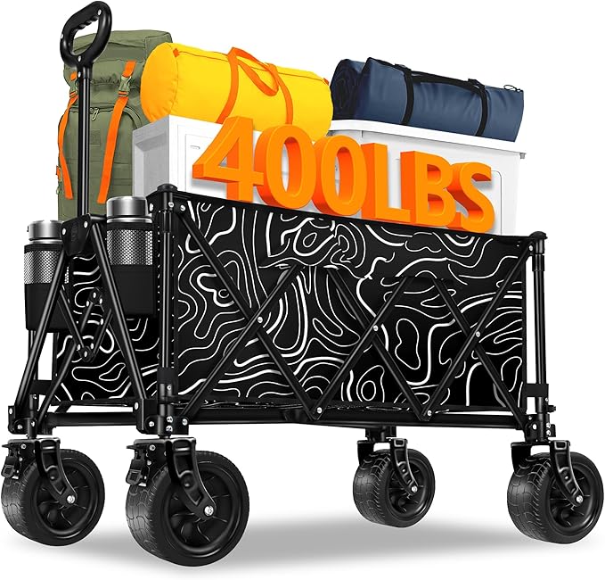 Collapsible Wagon with Big Wheels, Wagons Carts Foldable 400LBS Large Capacity, Heavy Duty Utility Cart Grocery Wagon w/Side Pockets and Brakes, All-Terrain Beach Cart for Camping, Sports, Shopping