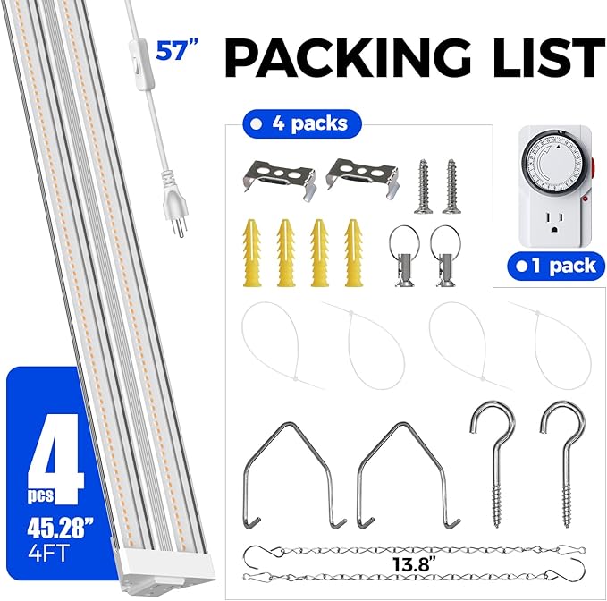 Barrina TX72 4FT Grow Lights for Seed Starting, 288W(4 x 72W, 2000W Equivalent), Full Spectrum, Linkable, High PPFD, Mechanical Timer, Grow Lights for Indoor Plants with On/Off Switch, 4 Packs
