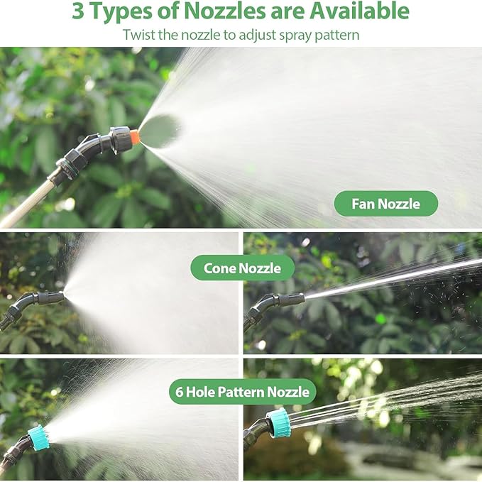 - 【3 Mist Nozzles & Telescopic Wand】Includes 3 Nozzles (Fan nozzle, Spray nozzle, 6 Hole nozzle) for weeding/disinfection/irrigation.Extendable 23.6" metal wand adapts to high branches or ground-level shrubs with adjustable spray angles