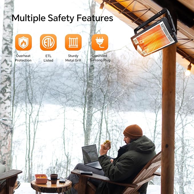 - 【 Fast Heating】This radiant heater is equipped with two high-efficiency quartz tubes that generate intense, sun-like warmth almost instantly. It effectively heats areas up to 300 sq. ft. in as little as 3 seconds, cutting through the chill quickly to keep your projects and relaxation uninterrupted by cold.