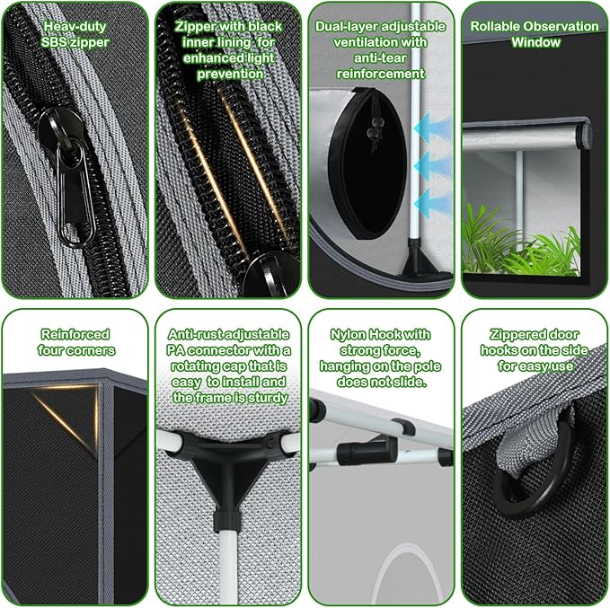 - Tool-Free Fast Installation--- Our grow tents are easy and fast to install without tools even if you've never done something like this before. The package includes the user-friendly and professional instruction well for easy set up.