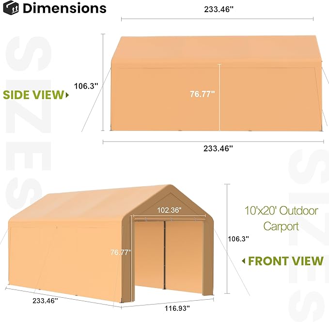 - 【UV & Weatherproof Canopy】This 10x20 carport is made of heat-sealed, triple-layer 200g polyethylene fabric, which is Anti-UV, waterproof, tear-proof, and can protect your car or boats against all four season elements, like sun, wind, rain, dust, hail, and snow.