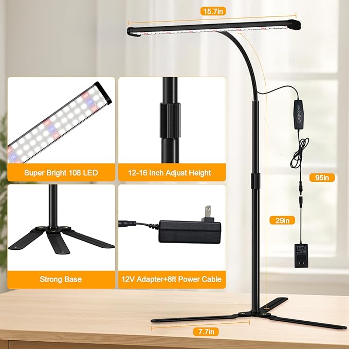 Super-Bright Plant Grow Light, 6000K 108LEDs Full Spectrum Plant Lamp with Timer 4/8/12Hrs & Height Extendable for Home Office Desktop Indoor Plants, 12V 3A High Power Output for Faster Growth