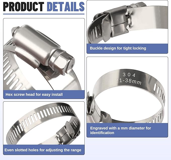 - PREMIUM MATERIAL: The buckle, band, and screw of these metal clamps are all made of heavy-duty 304 Stainless steel. Hose clamp kit has the features of corrosion resistance, anti-rust, salt resistance, waterproof, and oil-proof. No longer worry about them rusting and breaking when used in indoor and outdoor places