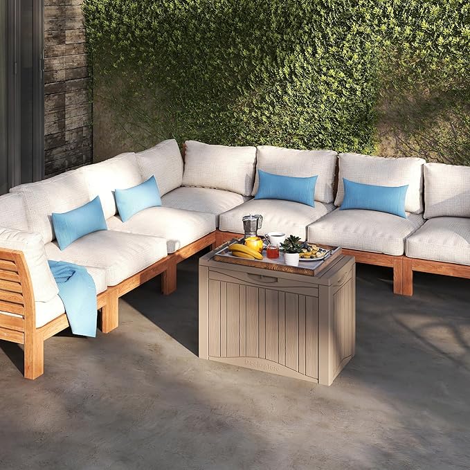 - Our deck box offers an impressive storage capacity, perfect for organizing patio cushions, pool accessories, gardening tools and more. This multipurpose storage solution not only helps keep your outdoor space tidy but also functions as a bench or table. Whether in your backyard or on the patio, this deck box is designed to meet your every need.