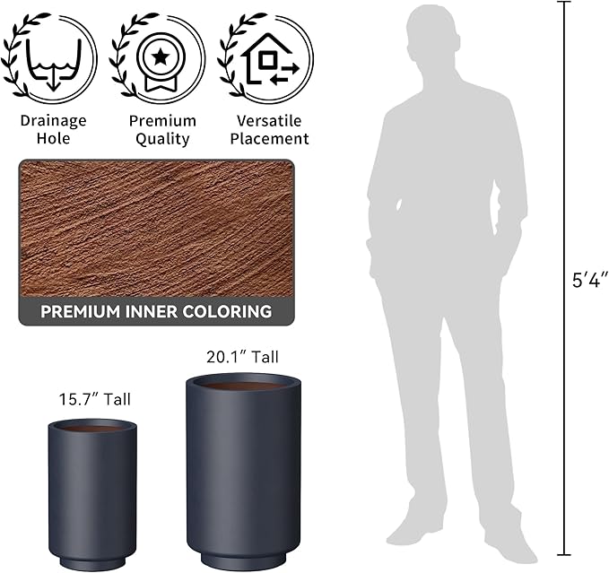 Kante 20.1 Inch Tall Concrete Planter, Round Pedestal Design Garden Pot for Indoor Outdoor Plants, Modern Garden Pot with Drainage Hole, Charcoal Finish with Warm Brown Interior