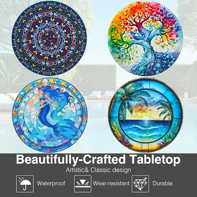 - 🌿High Quality Metal Patio Side Table: This metal side table top offers a stunning blend of colorful top with an elegantly curved black steel frame, blending with any room decor. With rust-proof coating design, it is fit perfectly into the outdoor environment. Easy to assemble