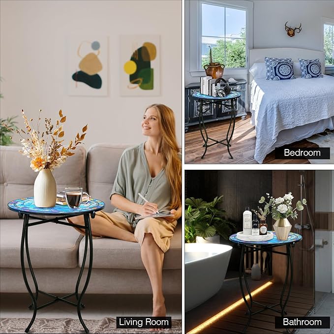 - 🌿High Quality Metal Patio Side Table: This metal side table top offers a stunning blend of colorful top with an elegantly curved black steel frame, blending with any room decor. With rust-proof coating design, it is fit perfectly into the outdoor environment. Easy to assemble