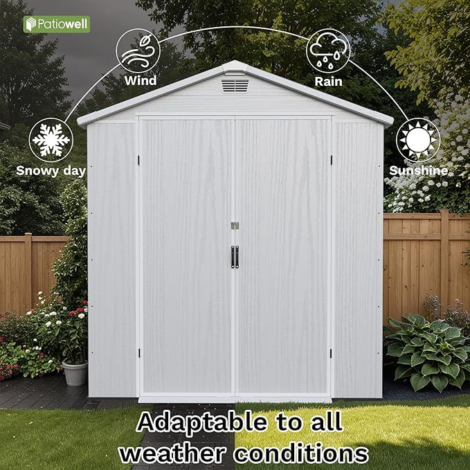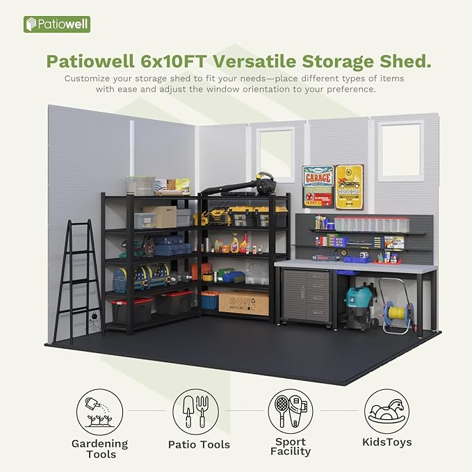 - Spacious & Versatile Storage: Measuring 73.4"L x 118"W x 83"H, the Patiowell 6 x 10 FT Shed offers extremly ample space for garden tools, bikes, lawn mowers, and patio furniture. Its high ceiling and open layout maximize vertical and horizontal space, ideal for organizing bulky items while doubling as a greenhouse or pet shelter.